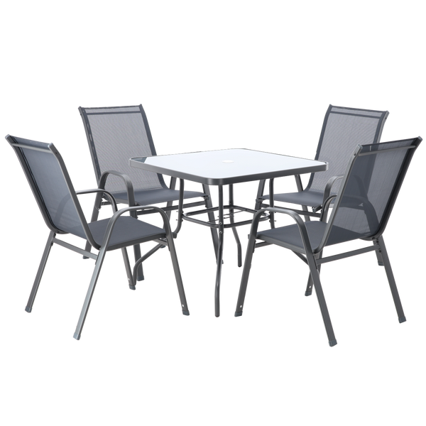 - Zestaw mebli ogrodowych (4 krzesła + kwadratowy stolik) w kolorze szarym.