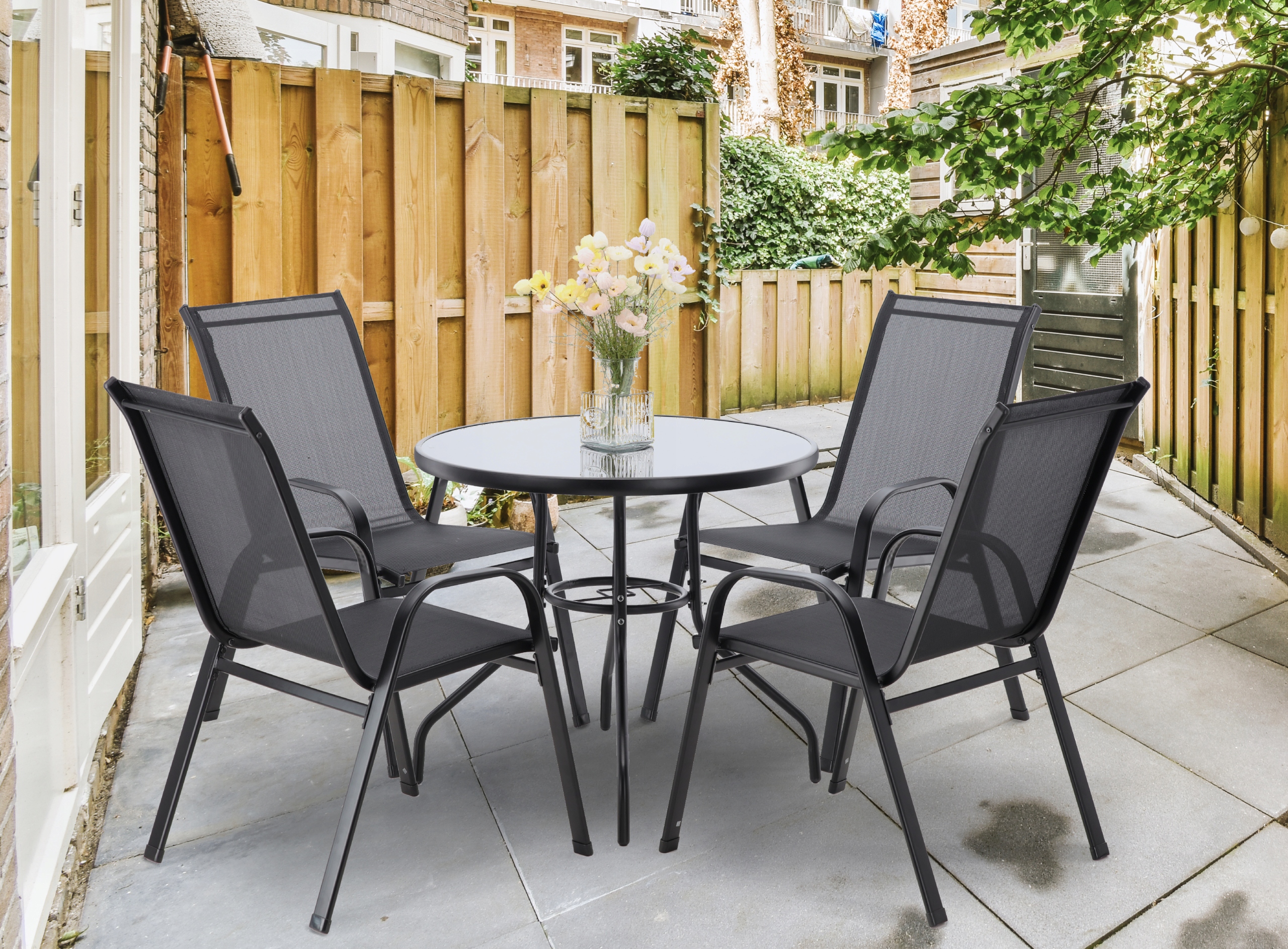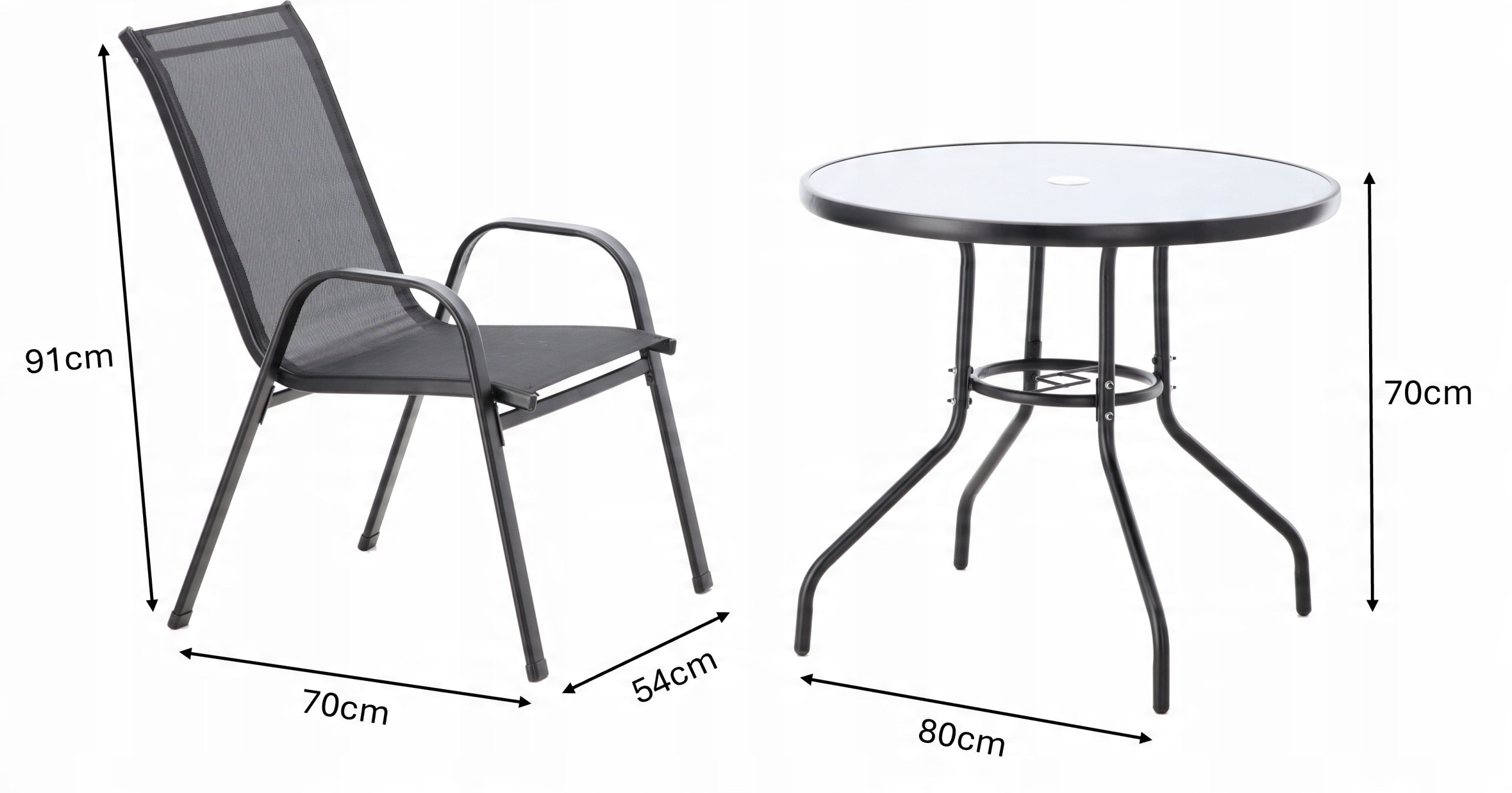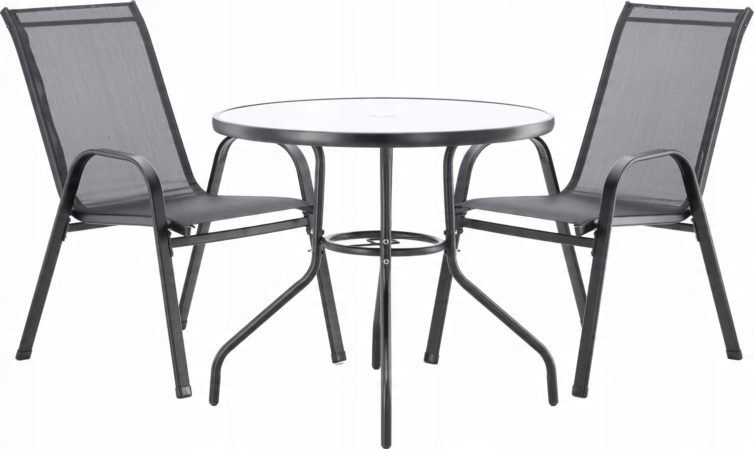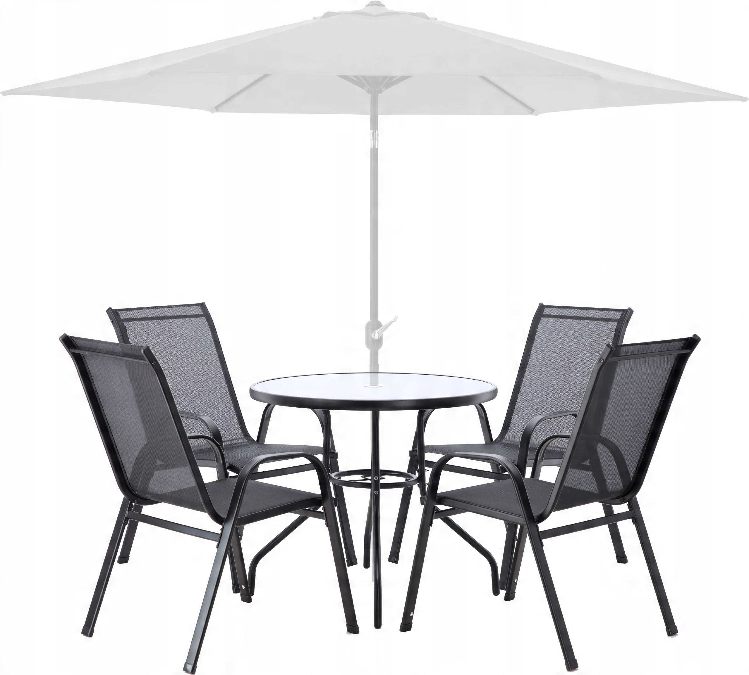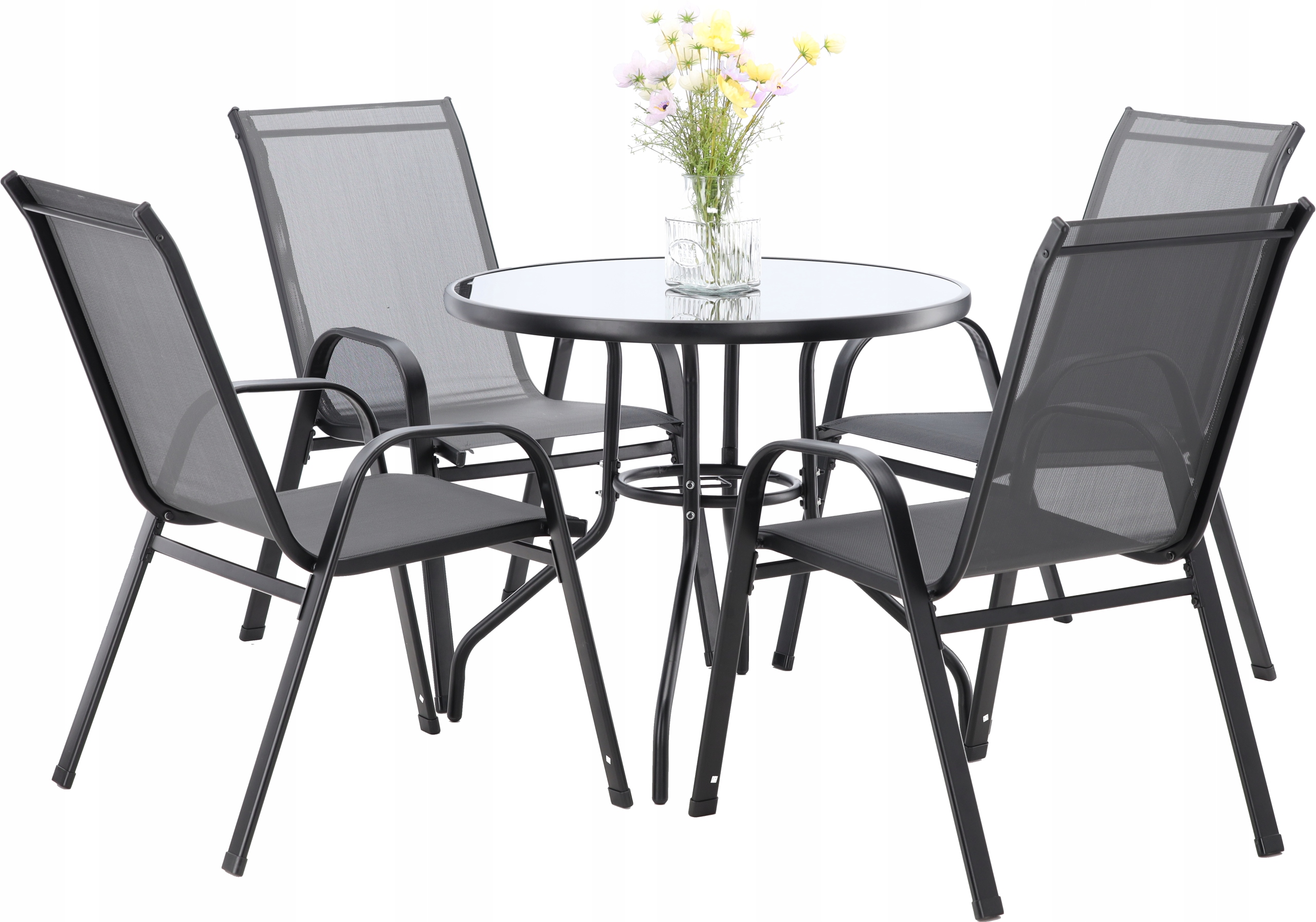 Zestaw mebli ogrodowych w kolorze czarnym, składający się z czterech wygodnych krzeseł oraz eleganckiego, okrągłego stolika ze szklanym blatem. Dzięki solidnej konstrukcji i trwałym materiałom zestaw doskonale sprawdzi się w ogrodzie, na balkonie lub tarasie. Nowoczesny wygląd i wygoda użytkowania czynią go idealnym wyborem na sezon letni.