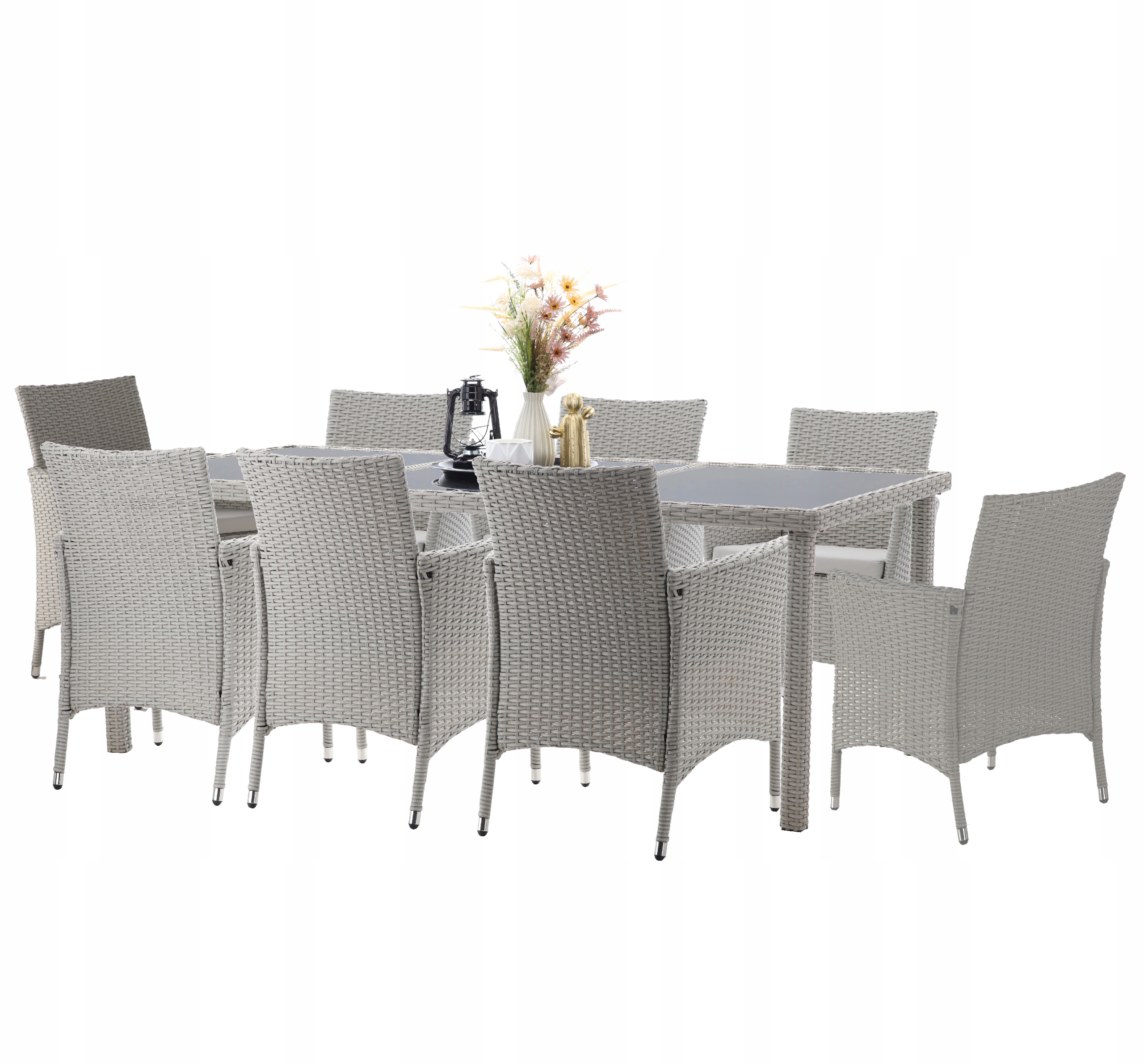 Elegancki zestaw obiadowy składający się z 8 krzeseł i dużego stołu. Wykonany z wysokiej jakości materiałów, zapewnia trwałość i odporność na warunki atmosferyczne. Stalowa rama cynkowana gwarantuje stabilność konstrukcji, a rattan dodaje estetycznego wyglądu. Wodoodporny materiał poduszek zwiększa komfort użytkowania, a hartowane szkło na blacie stołu podkreśla nowoczesny design.