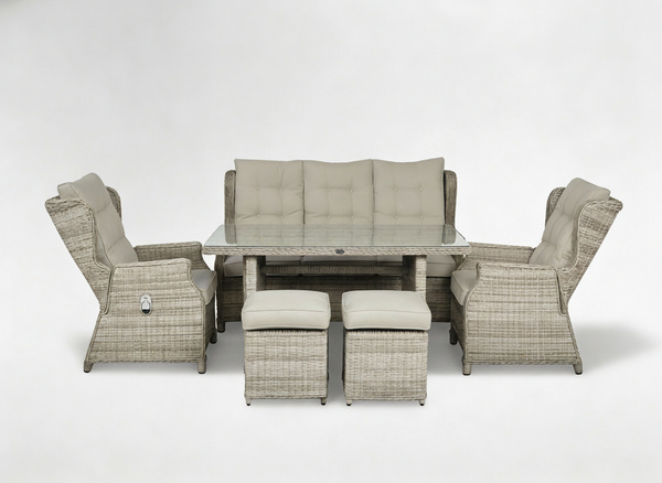 - Nowoczesny zestaw mebli ogrodowych z aluminium i rattanu. Sofa trzyosobowa, regulowane fotele, pufy i stół z hartowanym szkłem. Trwała konstrukcja, wygodne poduszki 10 cm i elegancki design idealny do ogrodu i na taras.