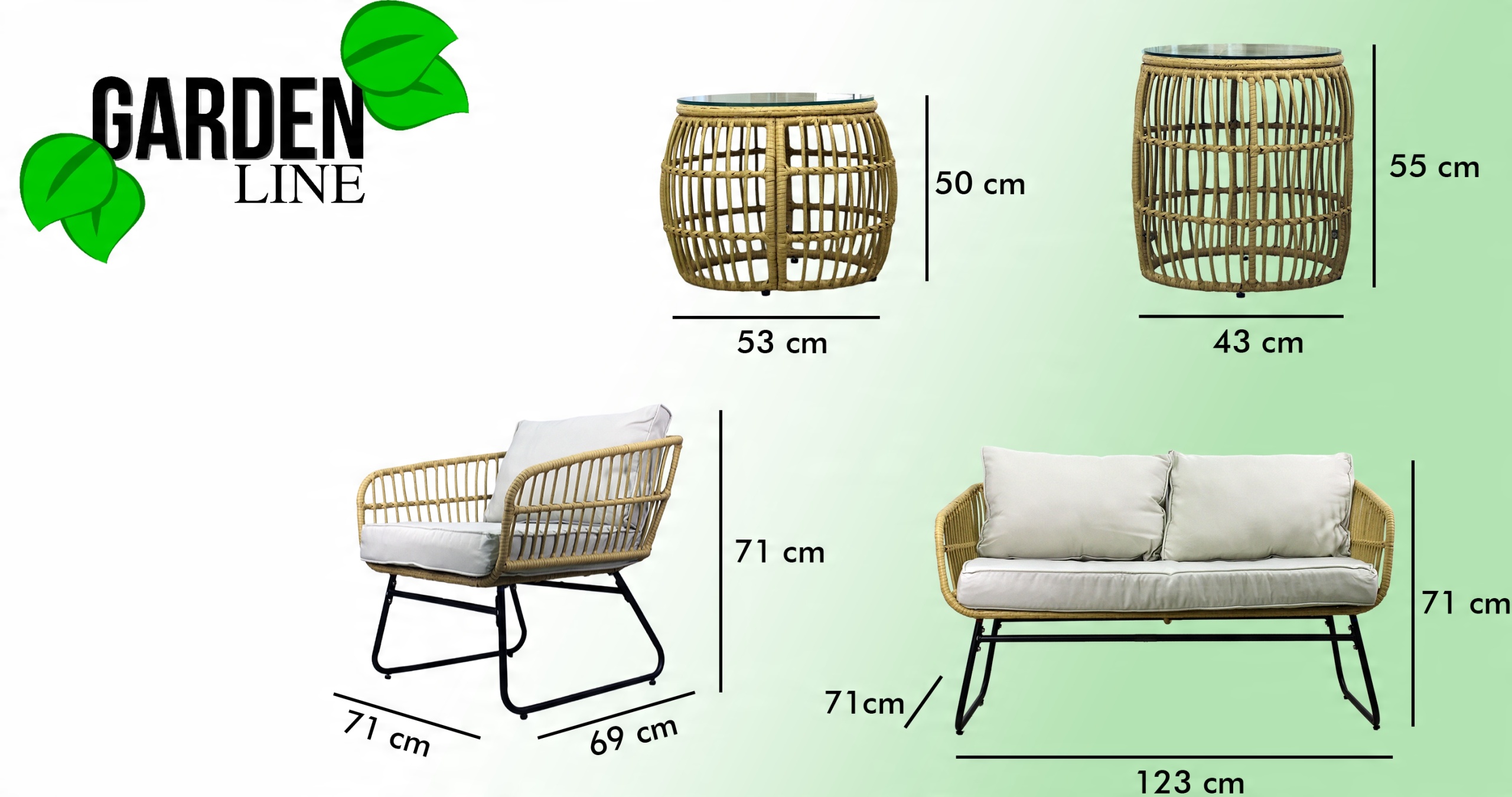 - Fotele (2 szt.): 71 × 69 × 71 cm