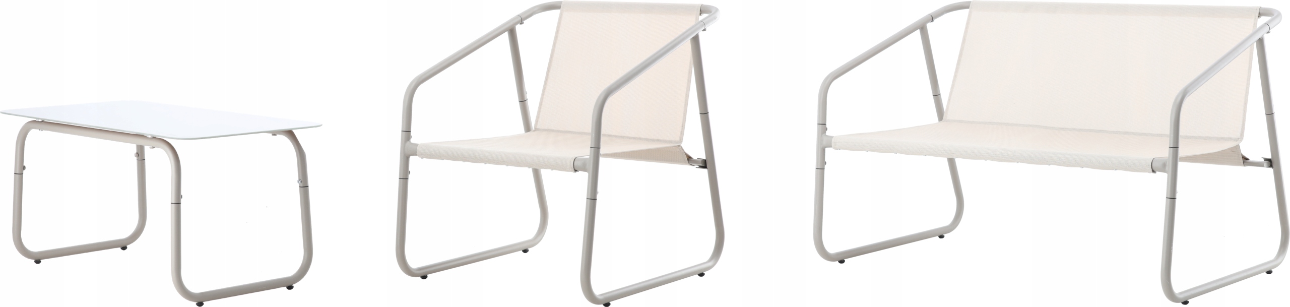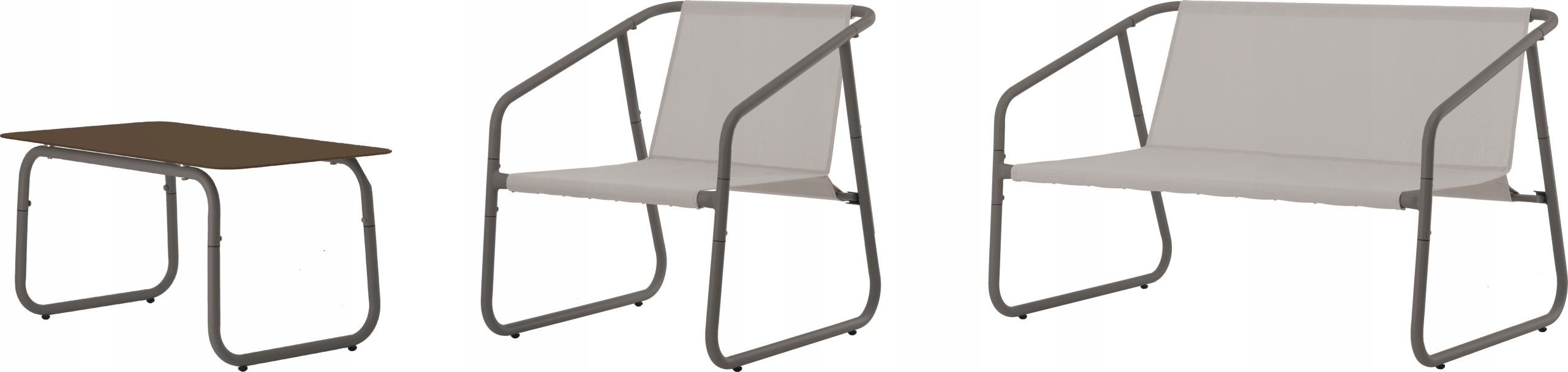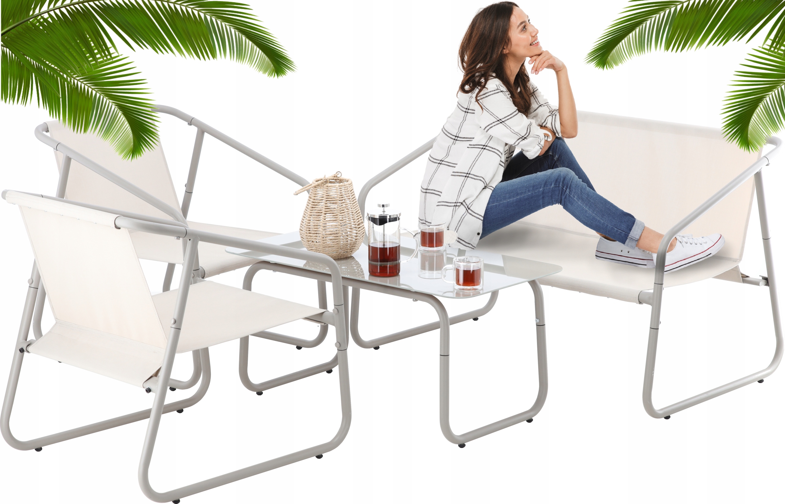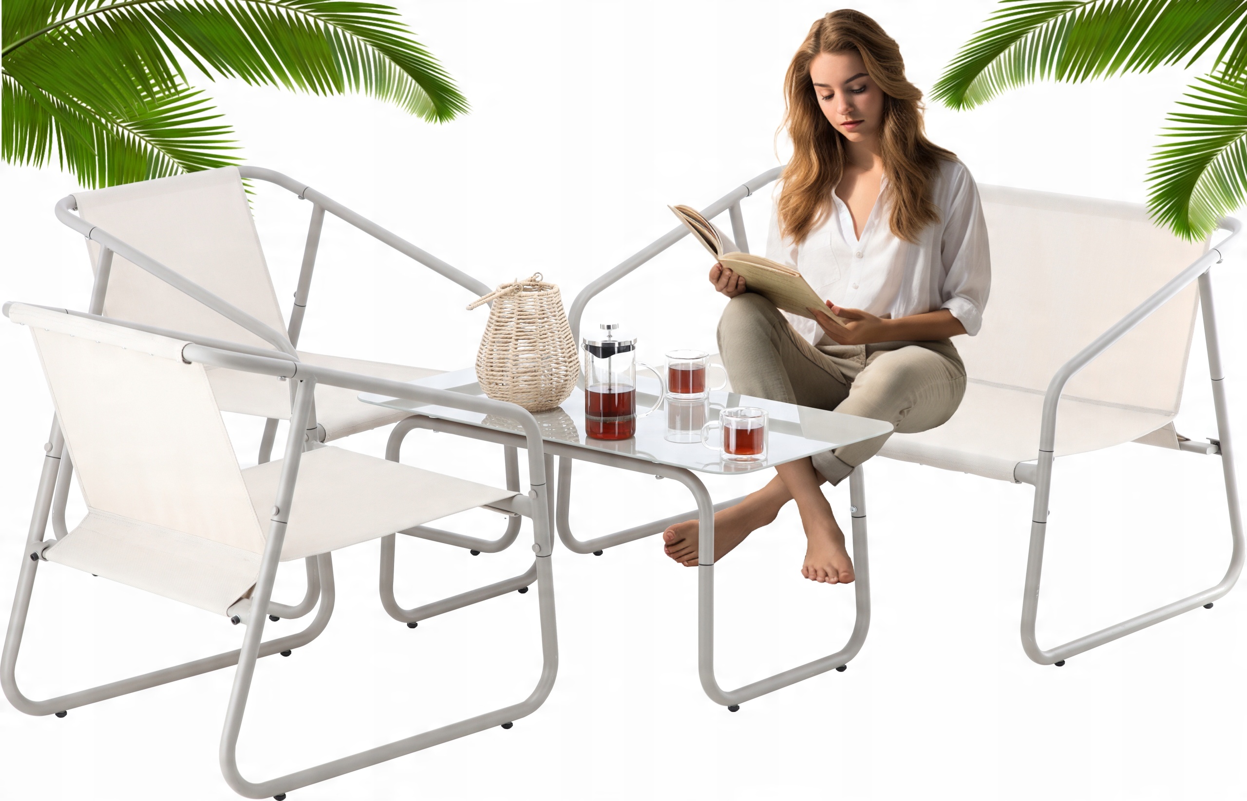 Zestaw mebli ogrodowych zawiera sofę dwuosobową, dwa krzesła oraz stolik. Doskonale sprawdzi się w ogrodzie, na tarasie, czy balkonie, łącząc funkcjonalność i estetykę w jednym. Solidna stalowa konstrukcja w połączeniu z eleganckim szkłem hartowanym zapewnia trwałość i komfort użytkowania.