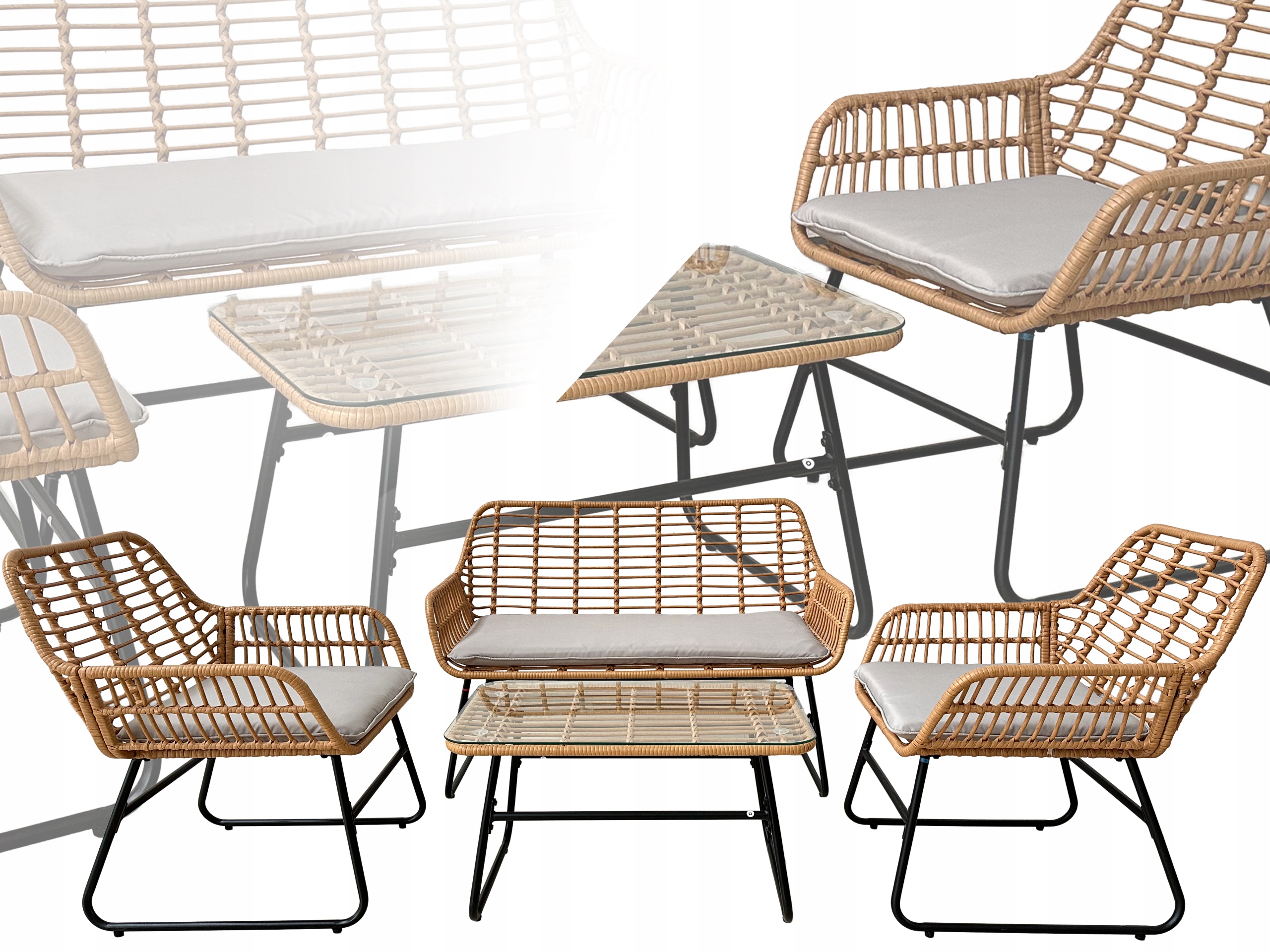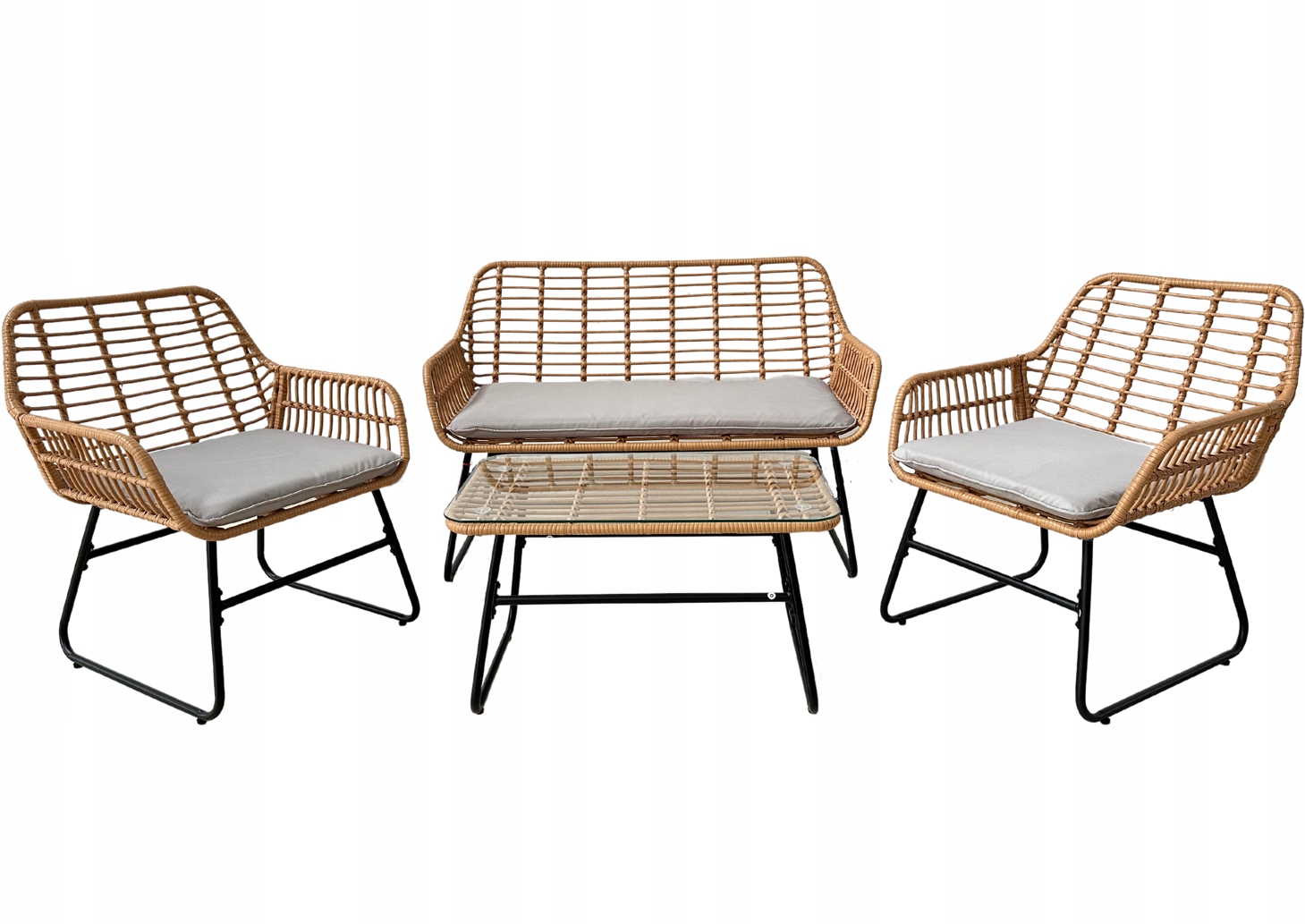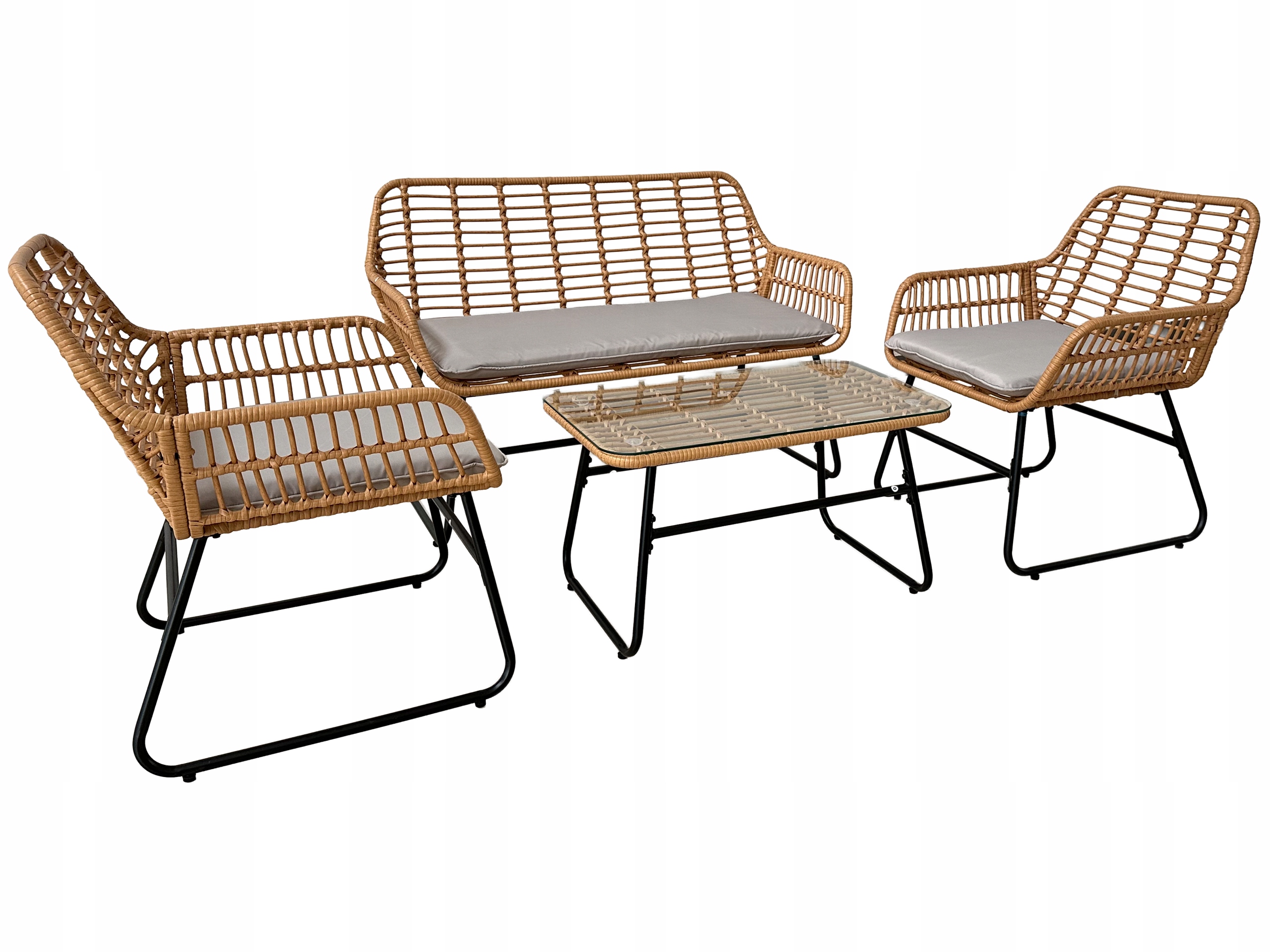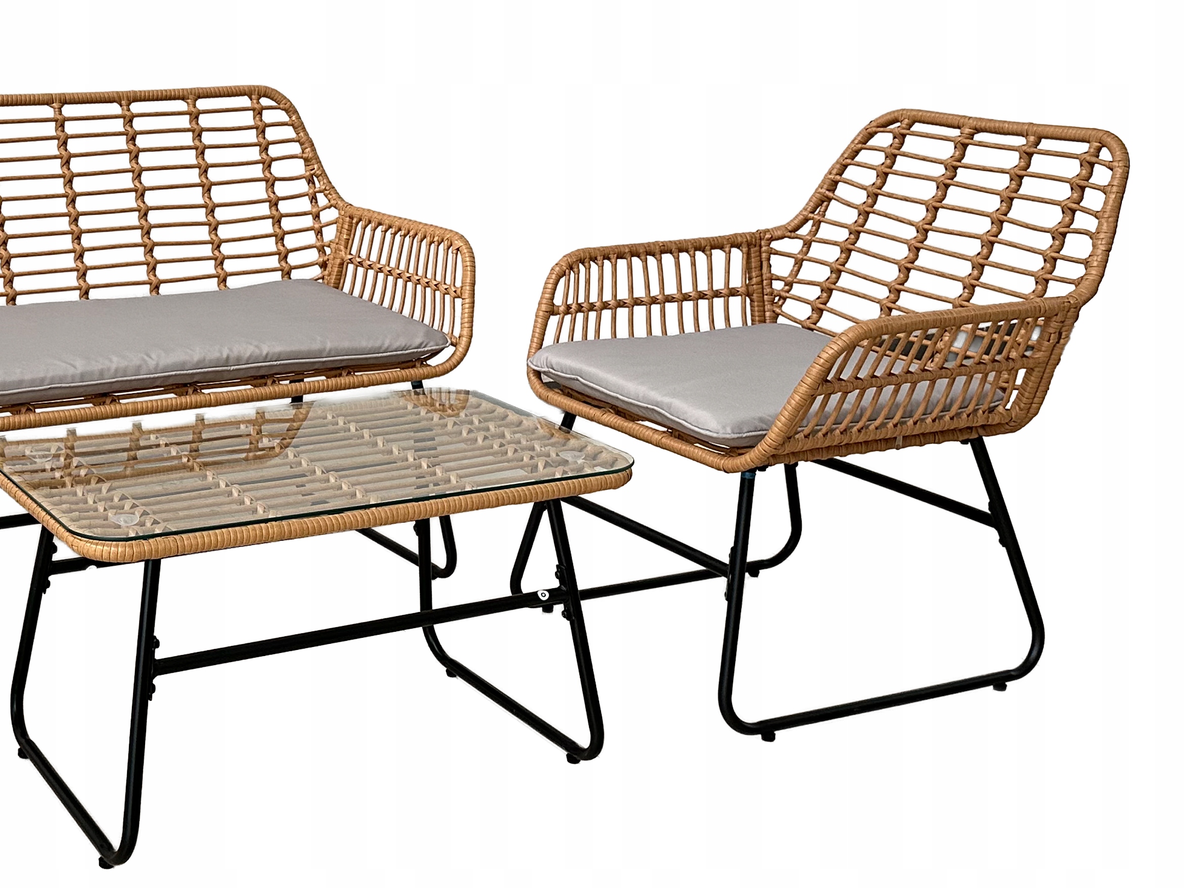 Stylowy i funkcjonalny zestaw mebli ogrodowych, który doskonale sprawdzi się na tarasie, w ogrodzie lub na balkonie. Solidna stalowa konstrukcja, elegancki rattan oraz wygodne poduszki zapewniają trwałość i komfort użytkowania. Szklany blat stolika dodaje elegancji i ułatwia utrzymanie w czystości.