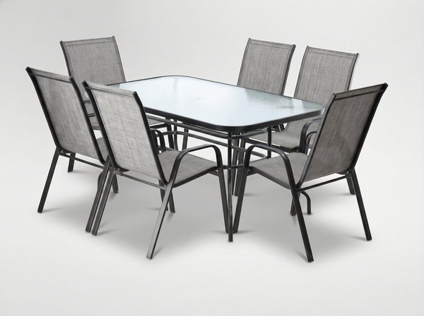 - Elegancki zestaw mebli ogrodowych: stół 150x90 cm z hartowanym szkłem i otworem na parasol oraz 6 wygodnych krzeseł. Stal malowana proszkowo, tekstylen 2x1, nowoczesny styl, trwałość i komfort do ogrodu i na taras.