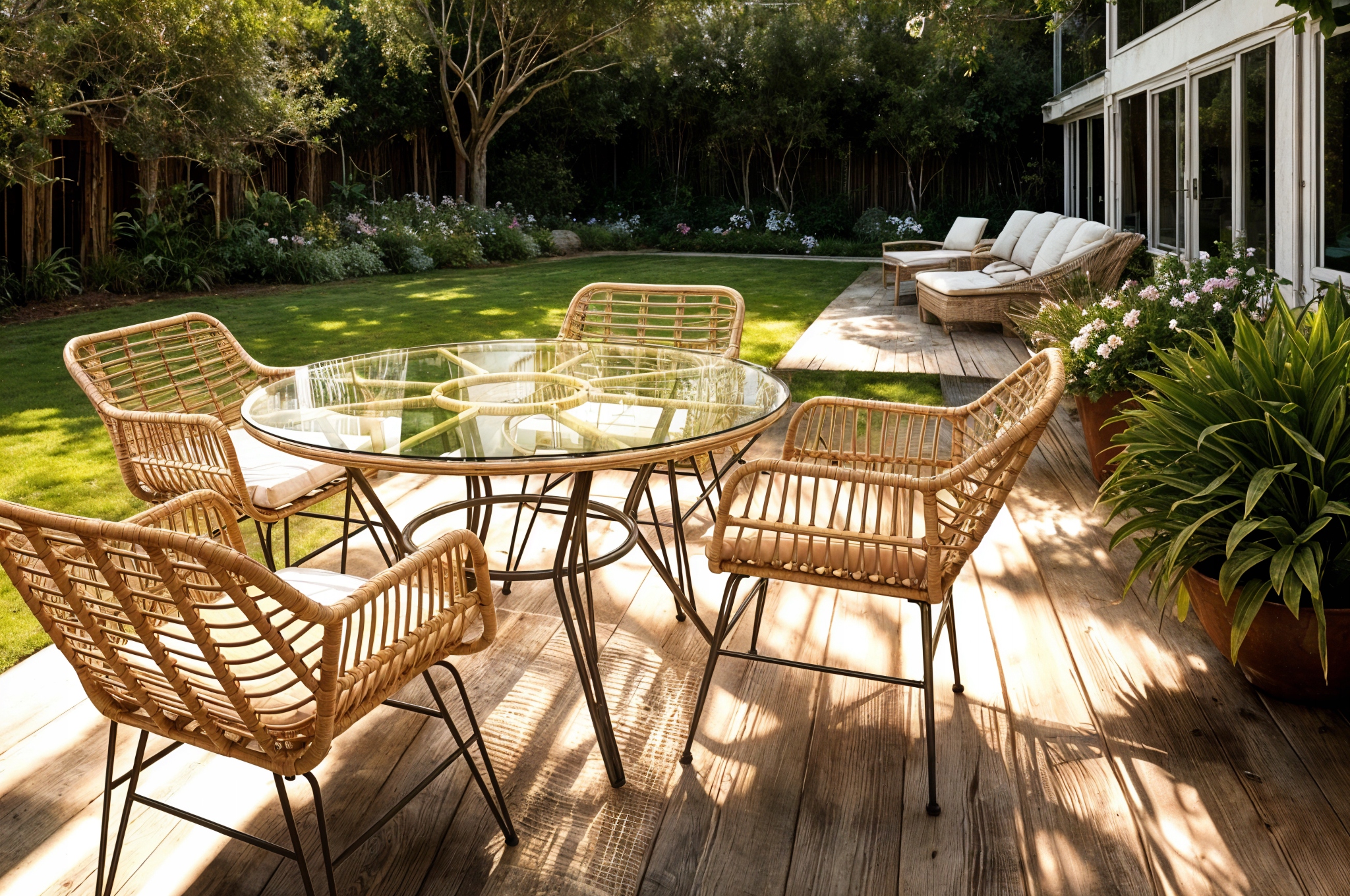 Nowoczesne połączenie brązowego rattanu z szarymi poduszkami pasuje zarówno do klasycznych, jak i bardziej nowoczesnych aranżacji. Neutralna kolorystyka doskonale komponuje się z zielenią ogrodu oraz innymi meblami i dodatkami.