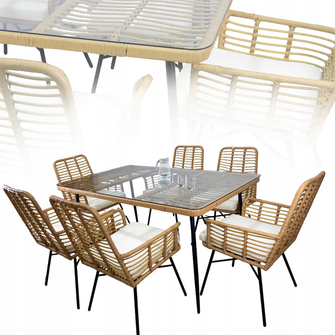 🌷 ZESTAW MEBLI OGRODOWYCH RATTAN STÓŁ SZKŁO HARTOWANE + 6 KRZESEŁ BEŻ
