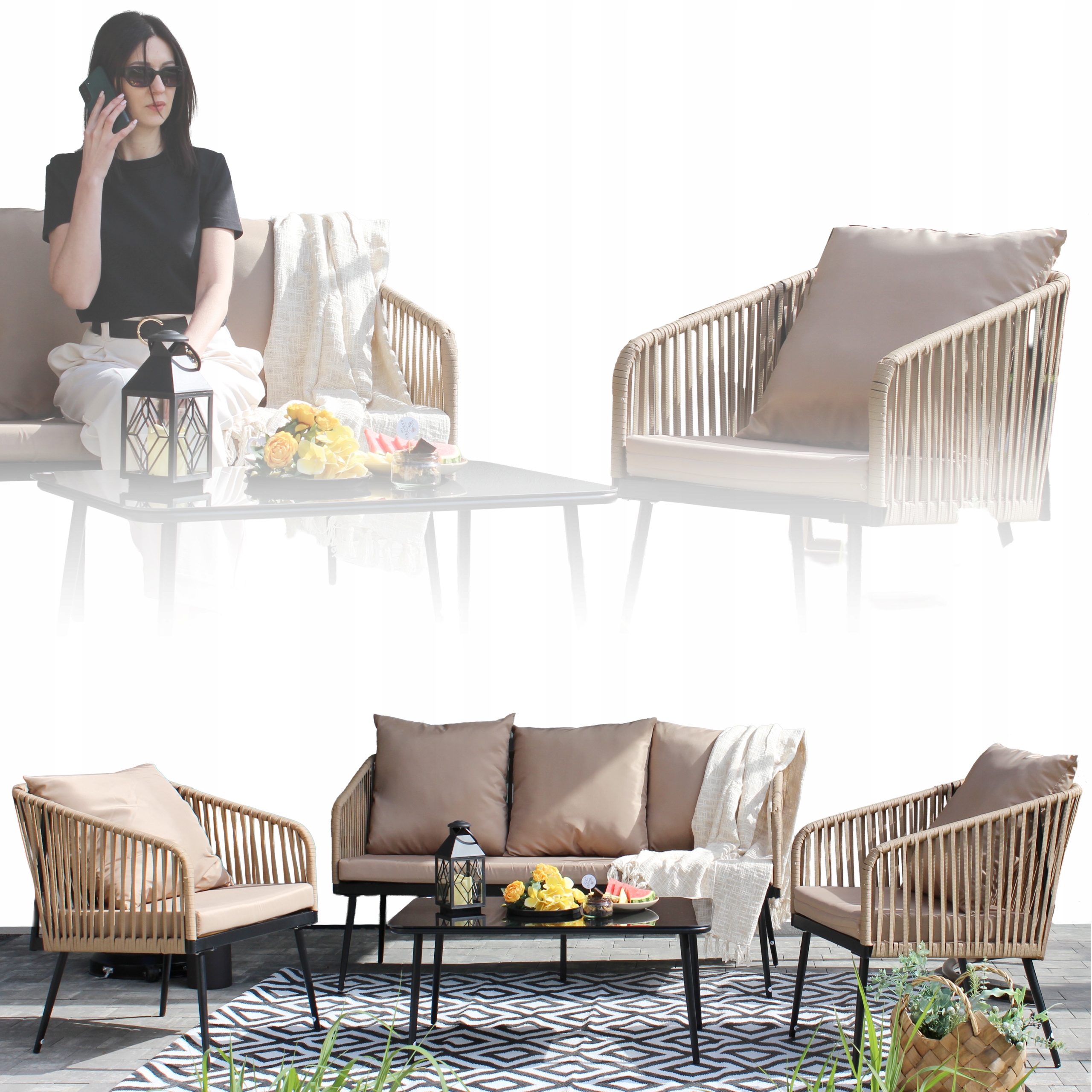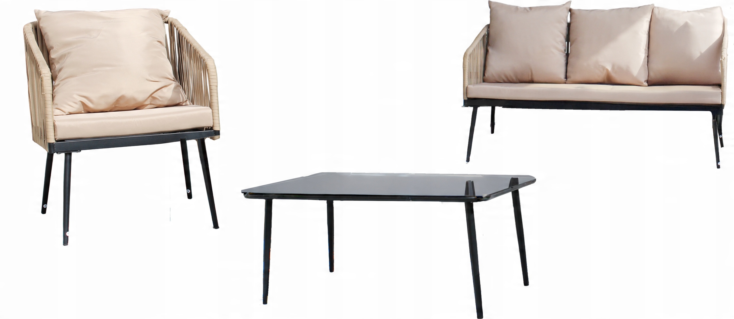ZESTAW MEBLI OGRODOWYCH Z PLECIONEJ LINY (2 FOTELE + SOFA + STOLIK) - BEŻOWY, PODUSZKI - BEŻOWE *8517