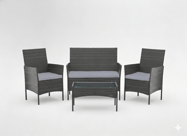 - Elegancki zestaw mebli ogrodowych z technorattanu w kolorze szarym. Sofa, fotele i stolik ze szkłem hartowanym zapewniają komfort, trwałość oraz odporność na warunki atmosferyczne i promieniowanie UV.
