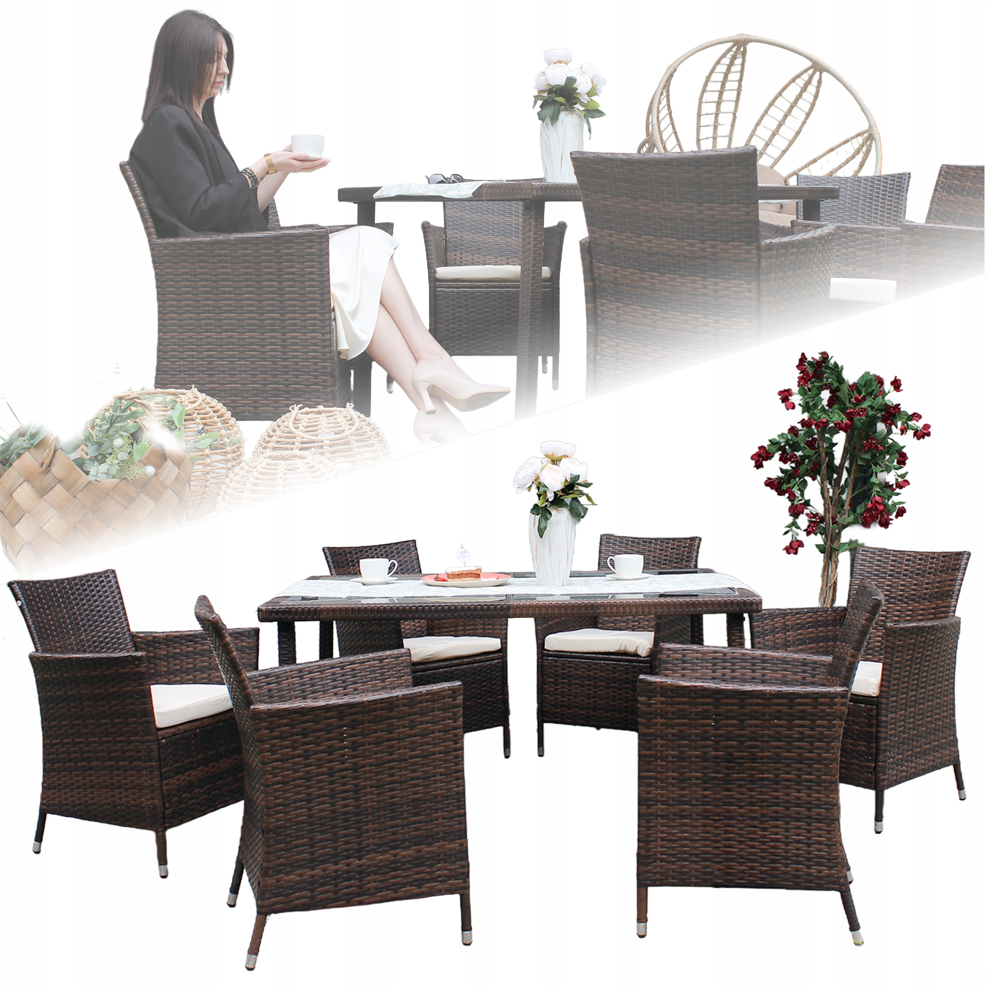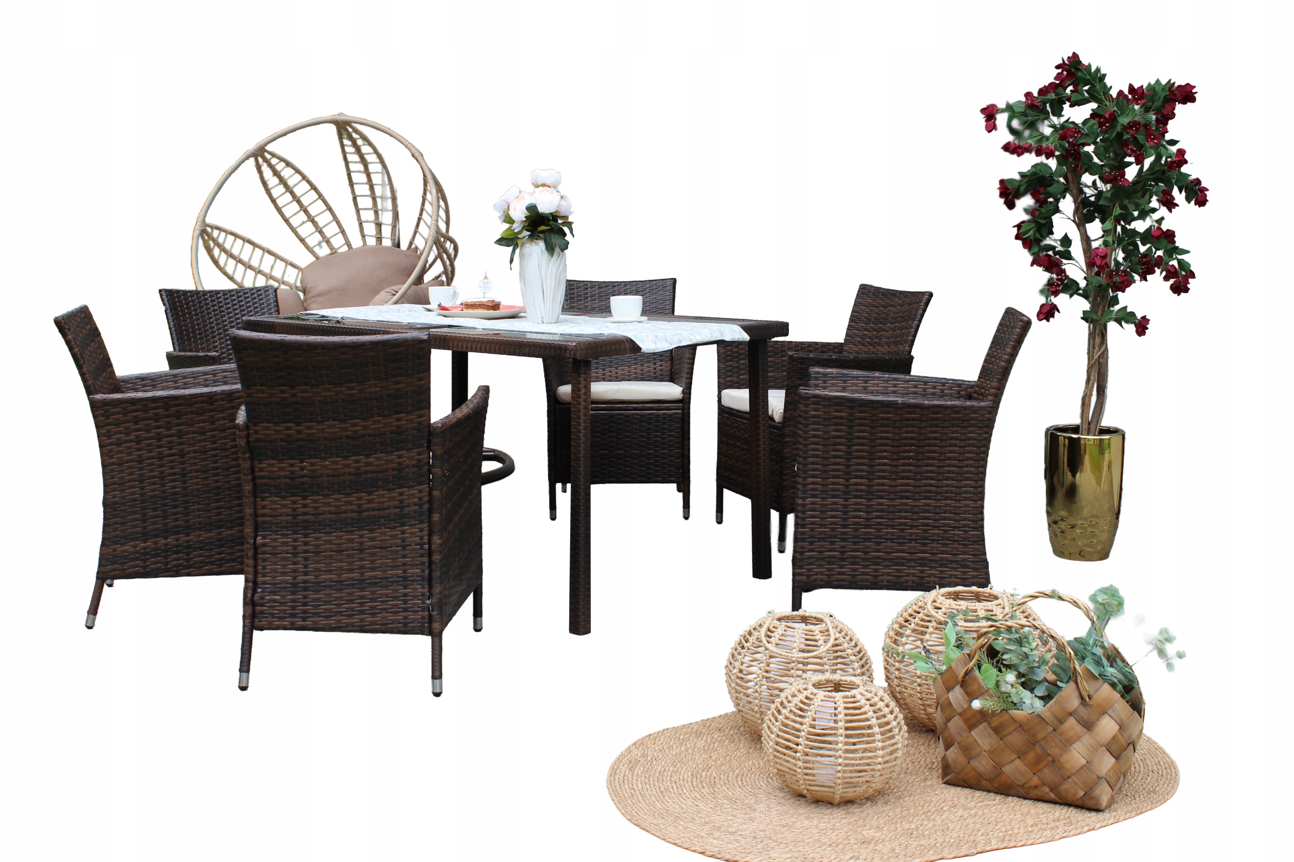 Zestaw mebli rattanowych - stolik kawowy + 6 krzeseł - ma wszechstronne zastosowanie i stanowi prawdziwą ozdobę ogrodu, tarasu, ogrodu zimowego lub salonu. Wygodne krzesła i elegancki stół zachęcają do spędzania czasu w gronie rodziny lub przyjaciół. Rattanowy zestaw zachwyca nie tylko eleganckim wyglądem, lecz również długim okresem użytkowania. Bardzo wygodne beżowe poduszki z poliestru doskonale współgrają kolorystycznie z meblami. Zestaw nadaje się do ogrodu, na balkon, taras, do pokoju dziennego lub oranżerii.