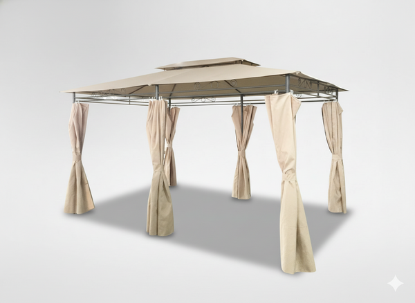 - Stabilny pawilon ogrodowy w kolorze beżowym o wymiarach 3x4x2,65 m. Stalowa konstrukcja malowana proszkowo, gruba tkanina poliestrowa, zasłony boczne na rzepy i zamek. Idealny do ogrodu i na taras.