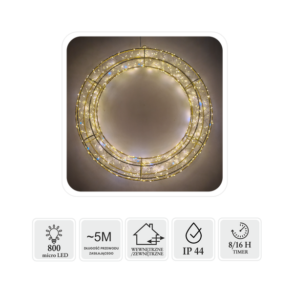 Coronita de Crăciun LED impresionantă cu un diametru de 50 cm, decorată cu nu mai puțin de 800 micro LED în culoarea alb cald cu flash rece la fiecare 10 diode. Datorită densității mari a beculețelor, creează o strălucire intensă, festivă, ideală pentru decorarea ușilor, pereților sau vitrinelor. Echipată cu un temporizator 8/16h și mod de iluminare constant + flash, garantează confortul utilizării și un aspect atrăgător. Clasa de etanșeitate IP44 permite utilizarea atât în interior, cât și în exterior.