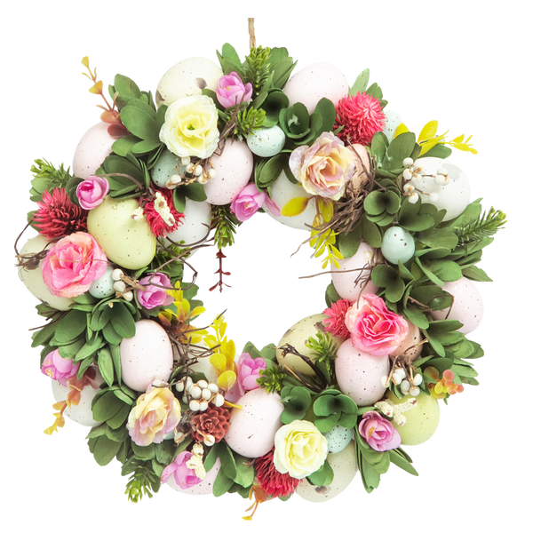 DECORAȚIUNE DE PAȘTE - CORONĂ DE 30 CM CU FLORI ȘI OUA *9967