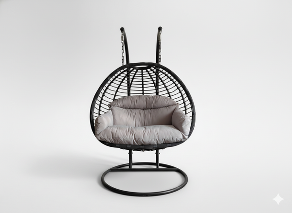 FOTEL WISZĄCY GASPAR DWUOSOBOWY – SZARY, SZARA PODUSZKA, CIEMNA SZARA RAMA ☁️
