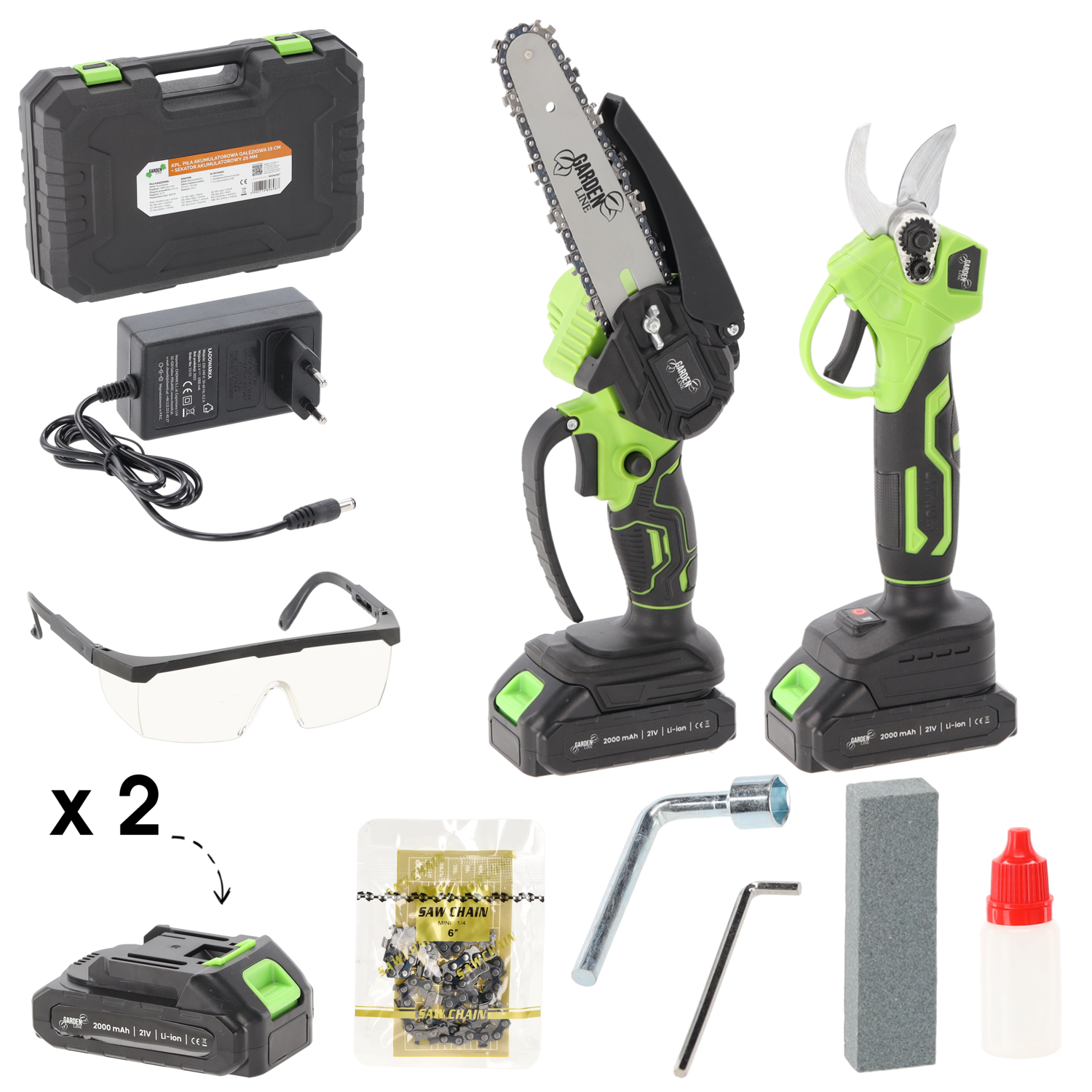 - 🔋 Kompletny zestaw – piła łańcuchowa + sekator akumulatorowy