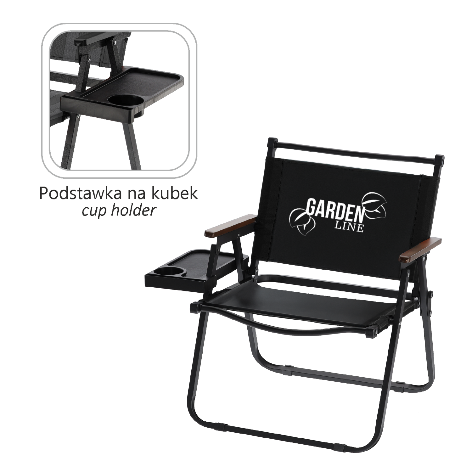 - Czarne krzesło turystyczne to klasyczne wyposażenie wyjazdowe wzbogacone użytecznymi dodatkami, zamontowanymi na profesjonalnej konstrukcji z trwałymi materiałami (stal i tkanina typu oxford). Posiada praktyczny stojak na kubek i pokrowiec.