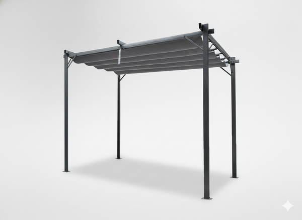 Stelaż naszej pergoli wykonany jest z profili stalowych malowanych proszkowo, co gwarantuje wytrzymałość i stabilność konstrukcji. Poszycie z kolei wykonane jest z grubej tkaniny poliestrowej o gramaturze 300 g/m2, która zapewnia nie tylko ochronę przed słońcem, ale także przed lekkim deszczem, dzięki swojej wodoodpornej konstrukcji.