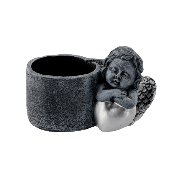 Vază cmentar din ciment elegantă, decorată cu un îngeraș delicat în nuanțe de gri închis și argintiu. Ideală pentru a sublinia cu clasă și respect locul de memorie al celor dragi. Rezistentă la condițiile atmosferice, astfel încât să păstreze un aspect frumos pe tot parcursul anului.