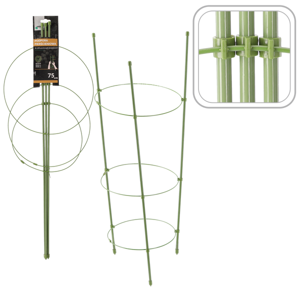 Suportul circular cu stâlpi este o alegere excelentă pentru plantele în ghiveci și pentru rabate. Datorită execuției solide din metal și acoperirii din material plastic, este foarte rezistent la daune și la condiții meteorologice nefavorabile, iar prin culoarea verde devine aproape invizibil pe fundalul plantei. Util în special pentru cultivarea: afinelor americane, hortensiei. Previne "așezarea" plantei și permite o creștere armonioasă. Suportul circular poate fi o alternativă interesantă la diferite tipuri de stâlpi singulari. Culoarea verde a produsului se integrează perfect cu plantele, având și rol de decorare a grădinilor. Suportul trebuie plasat în pământ lângă plantă și tulpina trebuie legată de acesta, asigurând astfel o stabilizare excelentă și o protecție împotriva ruperea, chiar și în condiții de vânt.