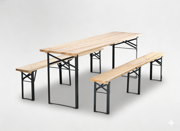 - Składany zestaw biesiadny 220 cm: stół i 2 ławki z drewna jodłowego i stali. Idealny na ogród, festyny i imprezy plenerowe. Trwała konstrukcja, łatwe przechowywanie, wysoka nośność i klasyczny design.
