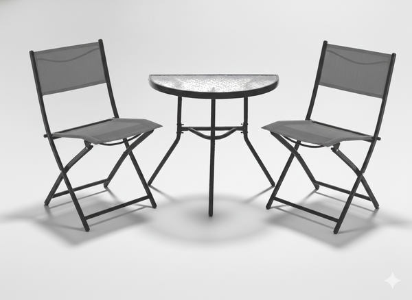 - Elegancki zestaw mebli balkonowych Garden Line: stolik półksiężyc ze szkłem hartowanym i 2 składane krzesła. Idealny na balkon i taras. Kompaktowy, trwały, oszczędza miejsce i zapewnia komfort użytkowania.