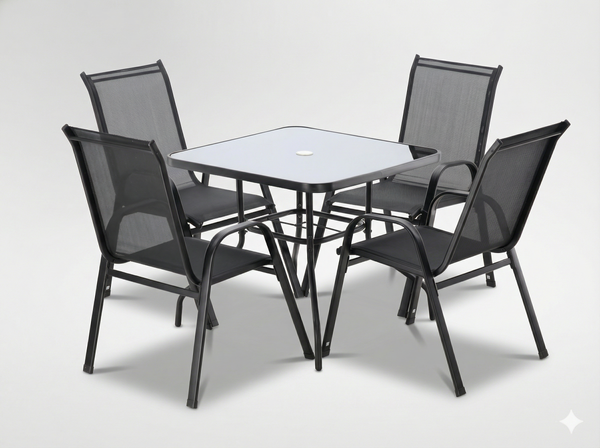 Nowoczesny zestaw mebli ogrodowych w kolorze czarnym, który składa się z czterech wygodnych krzeseł oraz kwadratowego stolika ze szklanym blatem. Solidna konstrukcja ze stali malowanej proszkowo oraz odporne na warunki atmosferyczne materiały sprawiają, że zestaw świetnie sprawdzi się w ogrodzie, na tarasie lub balkonie. Komfort użytkowania oraz elegancki wygląd gwarantują zadowolenie przez długi czas.