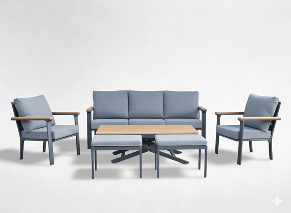 Stylowy 6-częściowy zestaw mebli ogrodowych, który doskonale sprawdzi się w ogrodzie lub na tarasie. Nowoczesny design w połączeniu z trwałymi materiałami zapewnia wygodę i elegancki wygląd. Konstrukcja wykonana z aluminium w kolorze antracytowym oraz elementy z drewna teakowego gwarantują długowieczność i odporność na warunki atmosferyczne.