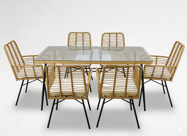 - Elegancki zestaw mebli ogrodowych z technorattanu: stół ze szkłem hartowanym i 6 wygodnych krzeseł z poduszkami. Idealny do ogrodu, na taras i patio. Trwała stalowa konstrukcja, stylowy design i wysoki komfort użytkowania.
