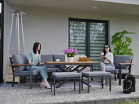 SADA ZÁHRADNÝCH NÁBYTKOV Z HLINÍKA A TEAKOVÉHO DREVA (POHOVKA + 2 KRESLÁ + STOL + 2 STOOLY) ANTRACITOVÁ + ŠEDÉ VANKÚŠE *0428