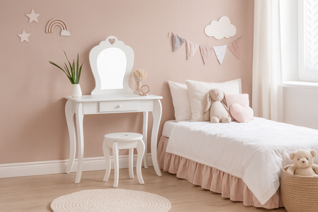 Biely kozmetický toaletný stôl so zrkadlom a stoličkou 🪑 je vysnívaný kus nábytku 🏷️ pre každé dievčatko 🎀. Vďaka nemu môže uskladniť svoje poklady 💍📦, učiť sa starať o seba 💄 a hrať si na dospelých 👒👠. Toaletný stôl bol navrhnutý tak, aby spájal funkcionalitu ⚙️ s elegantným vzhľadom 🌟 – bude ozdobou každej detskej izby 🏡🌸.
