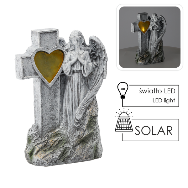Socha anjela stojaceho pri kríži so srdcom LED, symbolizujúceho lásku a obetu. Vyrobená v jemnej šedej farbe, dokonale sa hodí na dekoráciu cintorína.