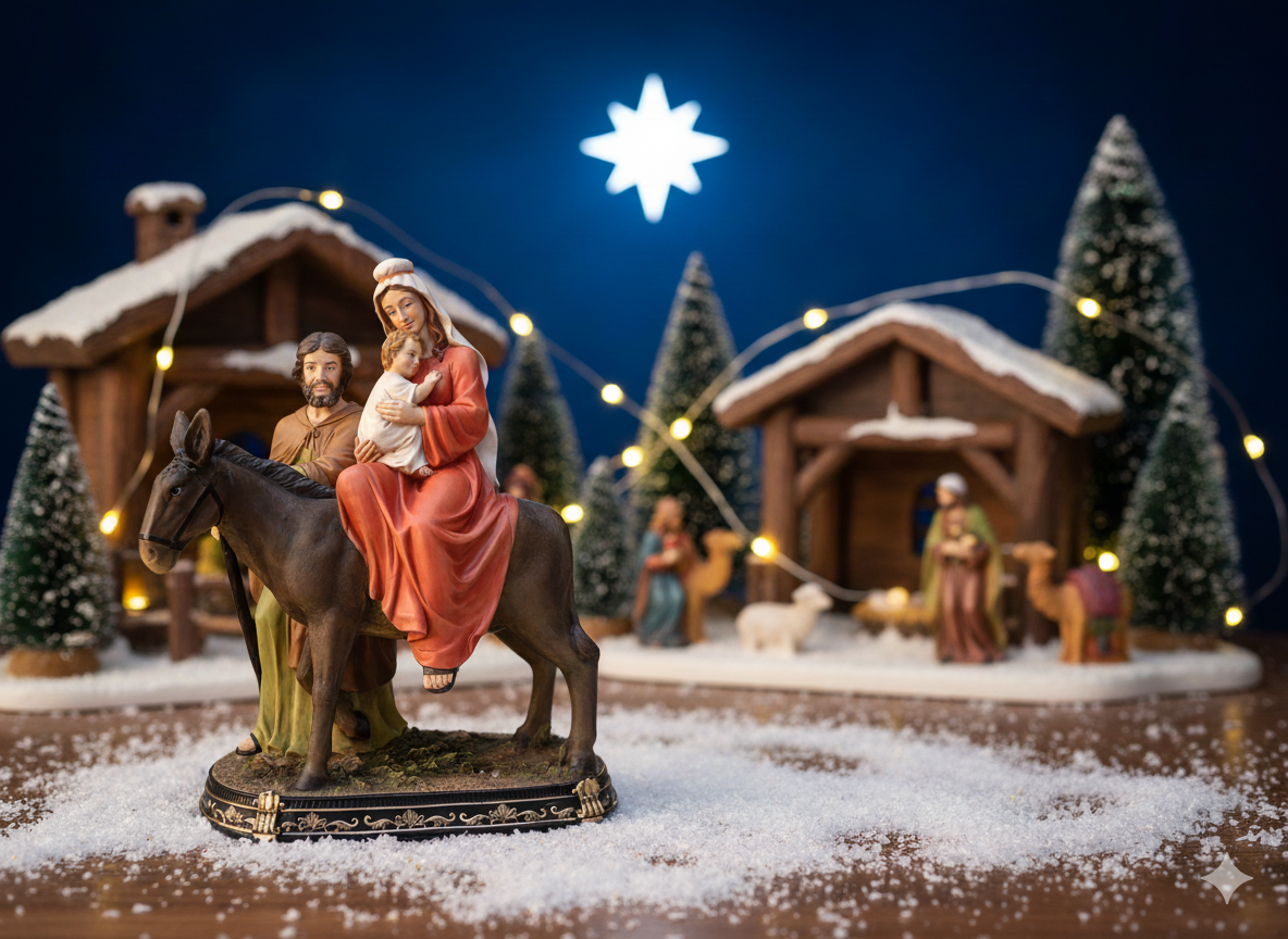 Wprowadź do swojego otoczenia wyjątkową atmosferę Bożego Narodzenia dzięki imponującej figurze przedstawiającej Świętą Rodzinę podróżującą na osiołku. To niezwykle realistyczne przedstawienie Maryi, Józefa i Dzieciątka Jezus zachwyca dbałością o detale i duchową symboliką. ✨