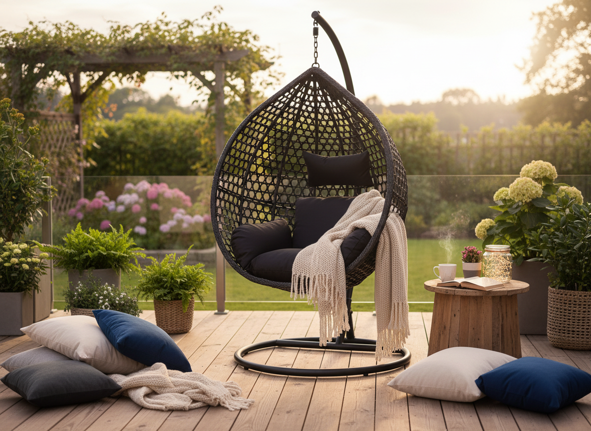 Zadbaj o swoje miejsce relaksu z wyjątkowym, czarnym fotelem wiszącym. Niezależnie czy w ogrodzie, na tarasie, czy we wnętrzu – będzie wyglądać olśniewająco i służyć przez lata. 🌙🖤
