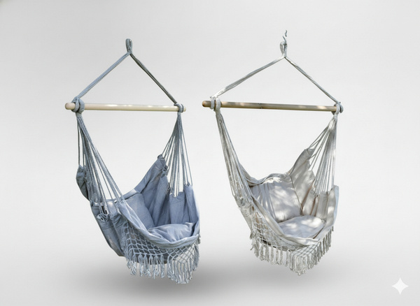 Odkryj nowy wymiar relaksu z brazylijskim krzesłem wiszącym w modnym połączeniu beżu i szarości. Ten stylowy hamak w klimacie BOHO odmieni każdą przestrzeń – od balkonu po salon!