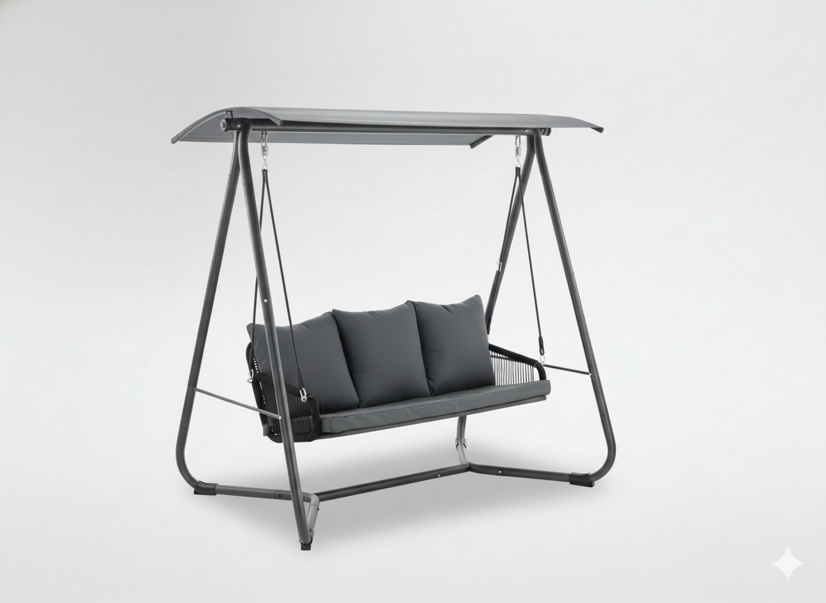 Poznaj huśtawkę premium, która łączy funkcjonalność, design i maksymalny komfort wypoczynku. Antracytowy kolor, ozdobne podłokietniki i grube poduszki sprawiają, że jest to elegancka i wygodna strefa relaksu do Twojego ogrodu.