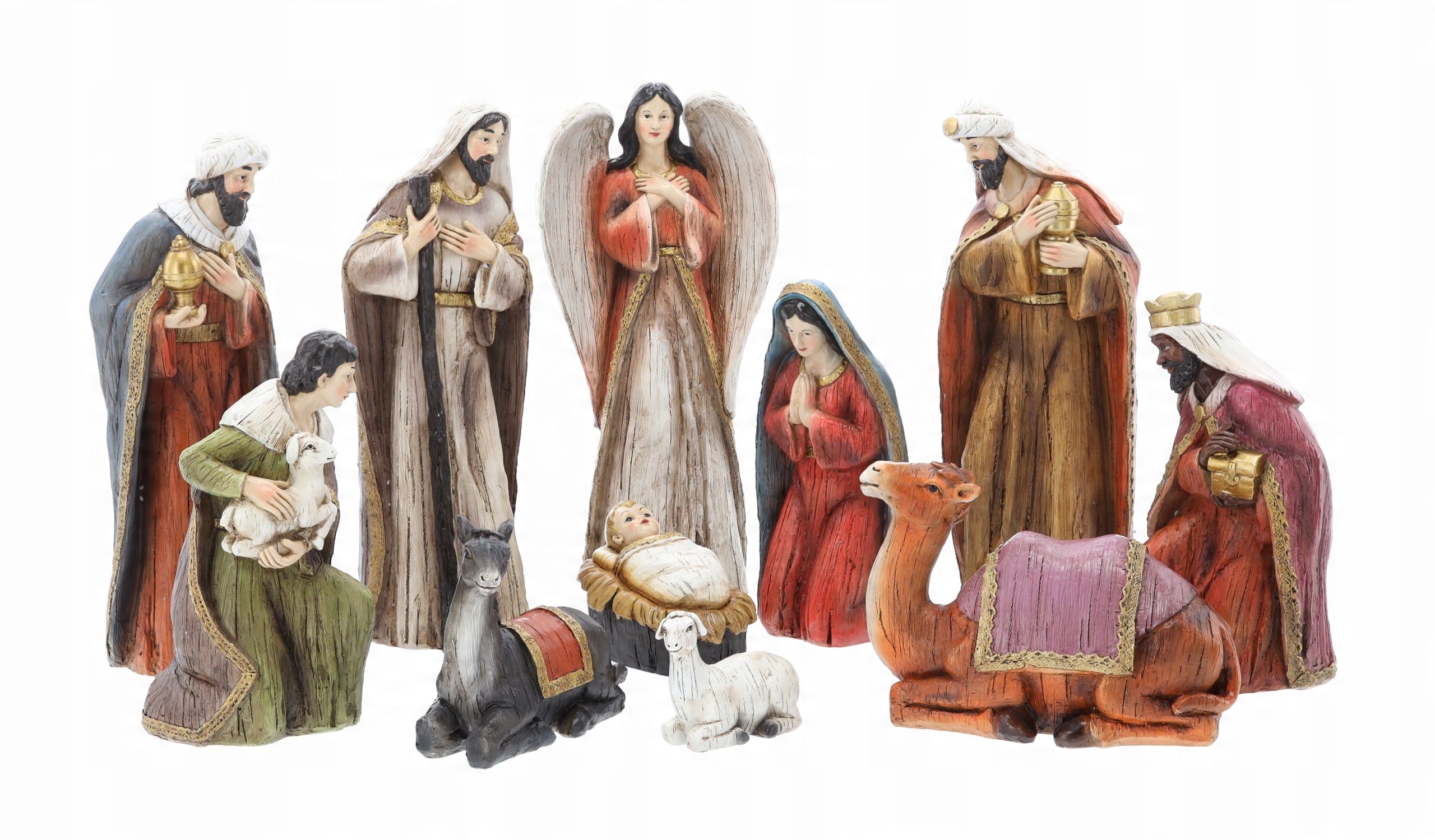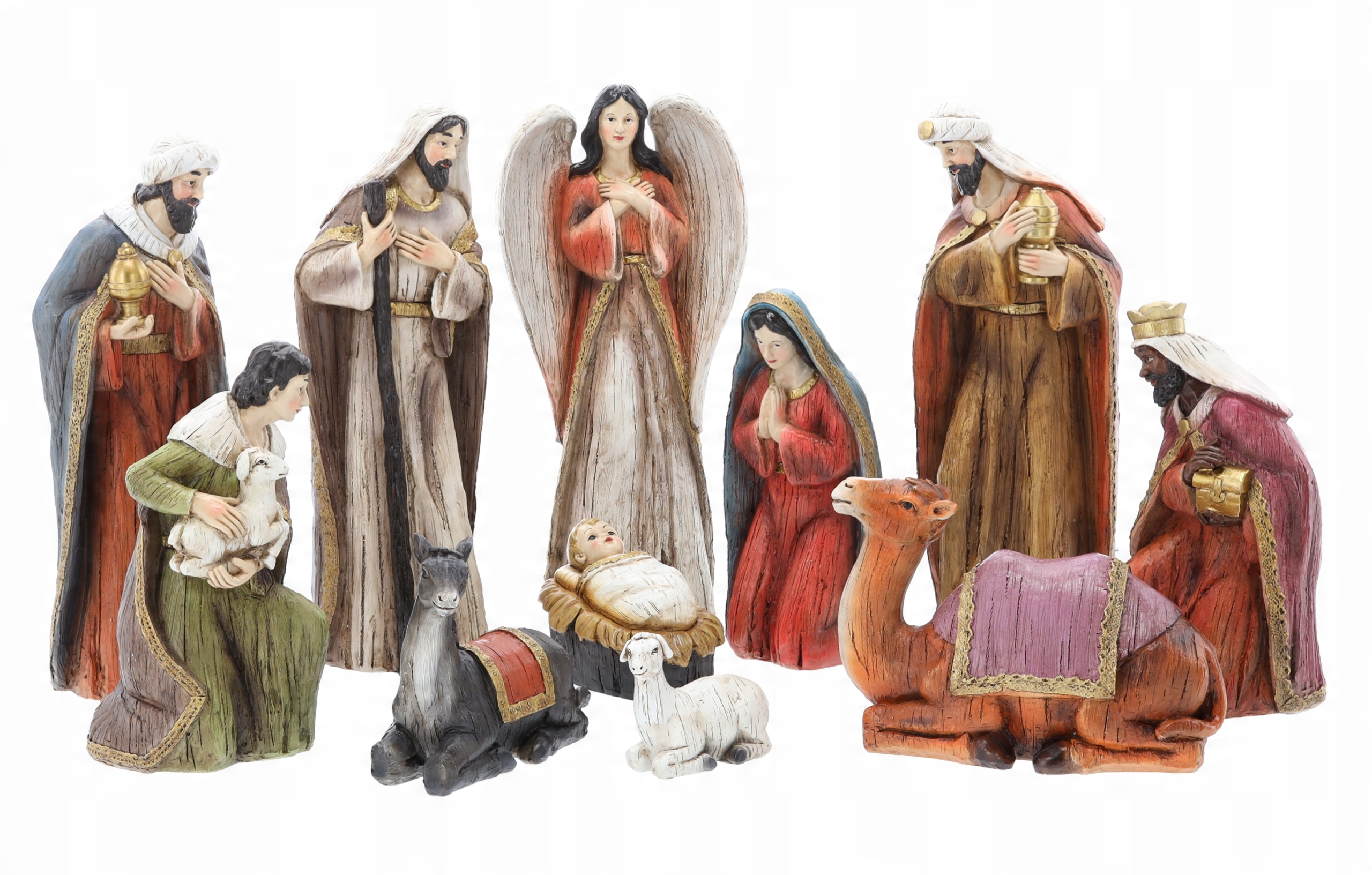 - Komplet 11 figur bożonarodzeniowych z polyresinu do 40,5 cm. Realistyczne detale, trwały materiał odporny na uszkodzenia. Zestaw zawiera Świętą Rodzinę, Trzech Króli, anioła, pasterza oraz zwierzęta. Do użytku wewnętrznego.
