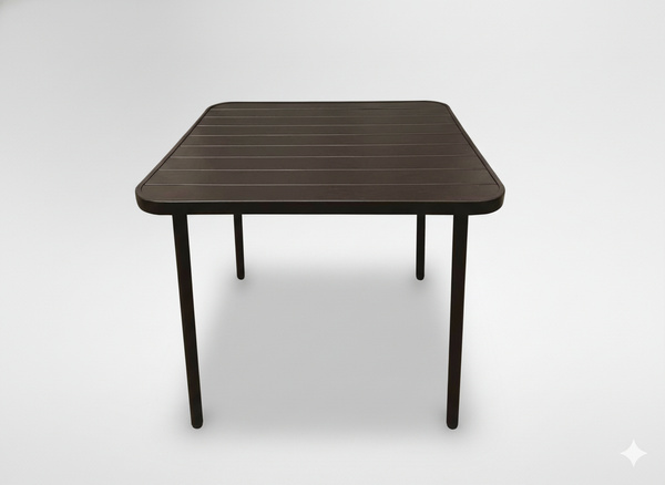- Brązowy stolik ogrodowy kwadratowy 80x80 cm z metalowym blatem z żelaznych listew. Solidna stalowa konstrukcja, stabilność i klasyczny design. Idealny do ogrodu, tarasu i balkonu. Możliwość stworzenia zestawu z krzesłami.