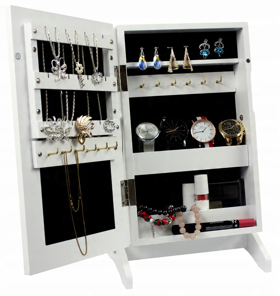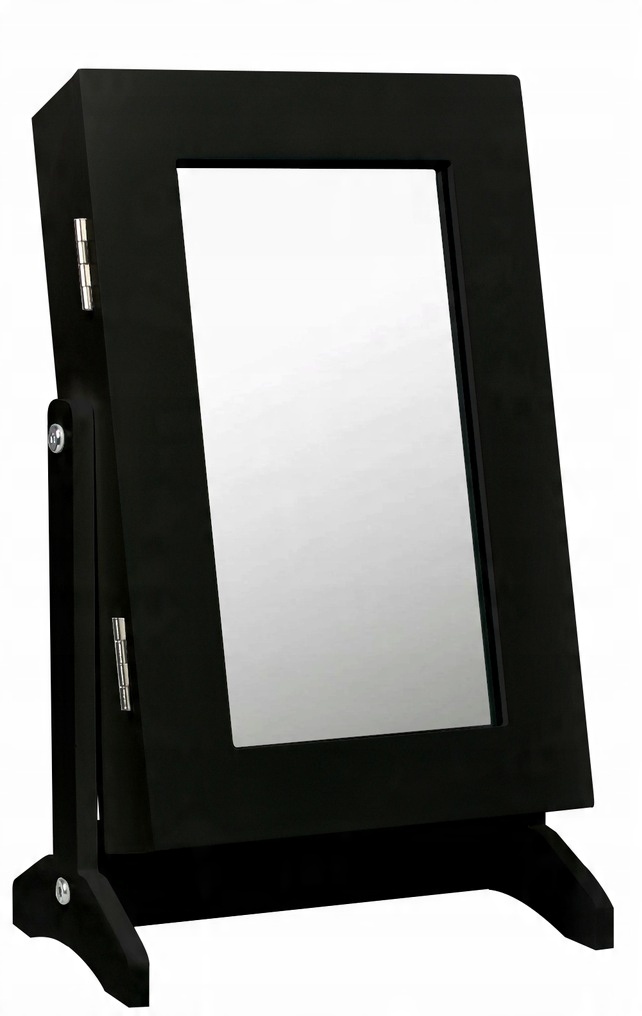 - Elegancka czarna szafka na biżuterię z lustrem. Kompaktowa i stylowa, z tapicerowanym wnętrzem, haczykami i półeczkami. Idealna do sypialni i garderoby, zapewnia porządek i ochronę biżuterii.