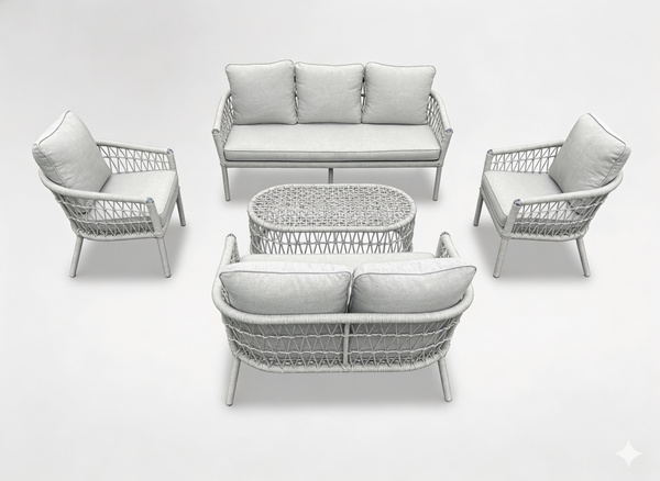 - Stylowy zestaw mebli ogrodowych z rattanu na aluminiowym stelażu. W skład wchodzą 2 sofy, 2 fotele oraz stolik z hartowanym szkłem. Szara kolorystyka, grube poduszki 10 cm i wysoka odporność na warunki atmosferyczne zapewniają komfort i trwałość.