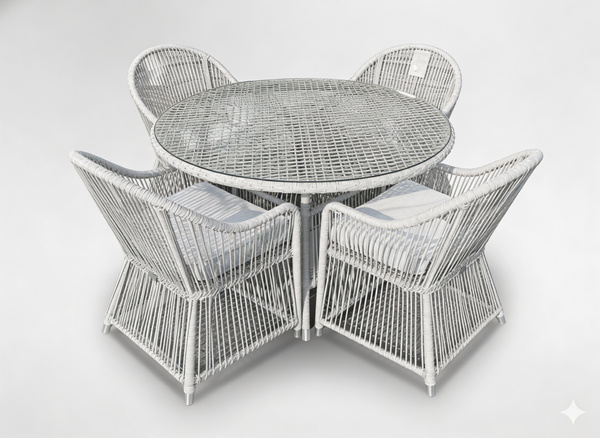 Stwórz przytulną i elegancką strefę wypoczynku w ogrodzie, na tarasie lub balkonie. Ten stylowy zestaw mebli ogrodowych złożony z 4 foteli i okrągłego stolika to idealne połączenie nowoczesnego designu, trwałych materiałów i codziennej wygody ☀️☕