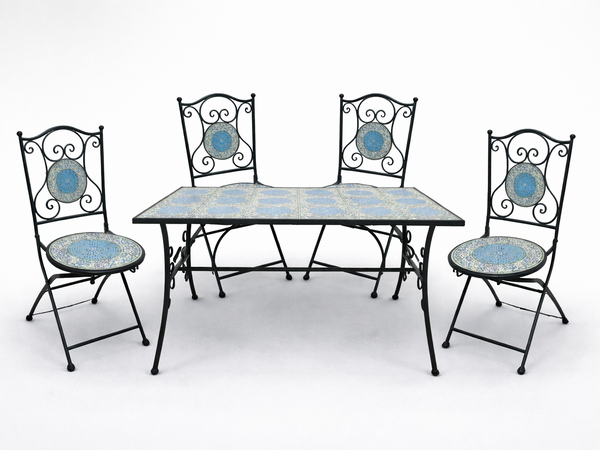 - Zestaw mebli ogrodowych OKEANOS to elegancki stół i 4 krzesła z metalową konstrukcją i dekoracyjną mozaiką. Idealny do ogrodu, tarasu lub patio. Trwały, stylowy i wygodny komplet do relaksu i spotkań.