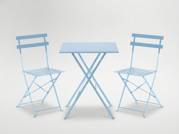Elegancki i kompaktowy zestaw mebli ogrodowych w kolorze niebieskim. Stół kwadratowy i dwa krzesła wykonane z wysokiej jakości stali galwanizowanej i malowanej proszkowo, co zapewnia trwałość oraz odporność na warunki atmosferyczne. Idealny do ogrodu, na taras oraz balkon.