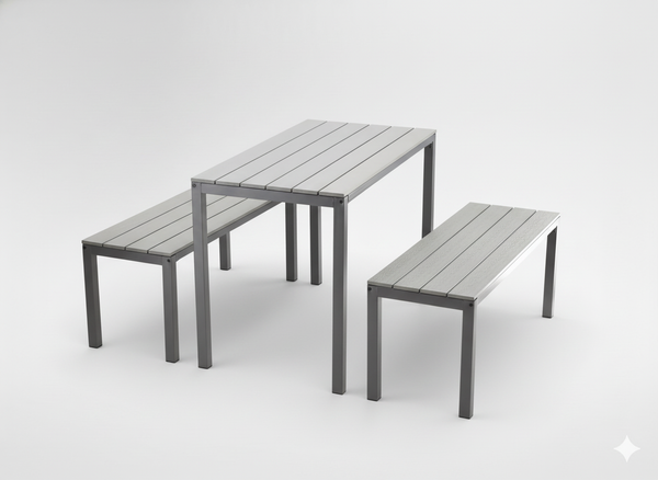 - Stylowy zestaw mebli ogrodowych: stół i 2 ławki Garden Line. Solidna stal malowana proszkowo, listwy imitujące drewno, odporność na warunki atmosferyczne. Idealny do ogrodu, na taras i imprezy plenerowe. Komfort i trwałość na lata.