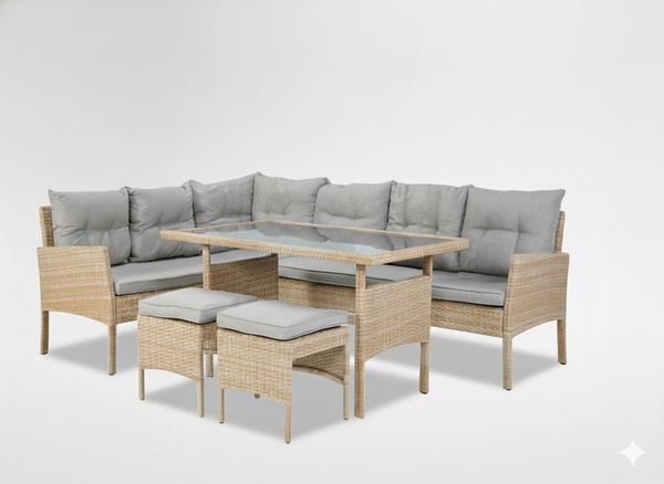- Zestaw mebli rattanowych BERNO w kolorze beżowym to narożnik, stolik i dwie pufy. Stalowa konstrukcja malowana proszkowo, podwójny rattan, wygodne poduszki oraz blat z hartowanego szkła zapewniają trwałość, komfort i elegancki wygląd ogrodu lub tarasu.